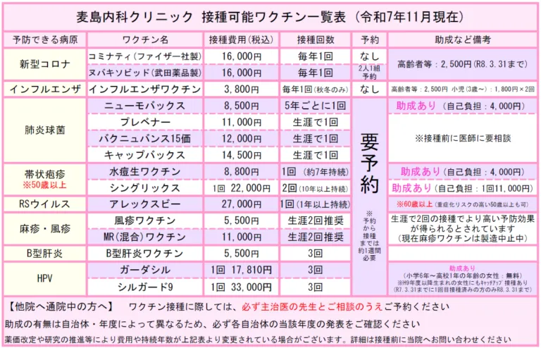 インフルエンザ・肺炎球菌・風しん・B型肝炎・帯状疱疹・RSウイルスワクチンを実施しています。